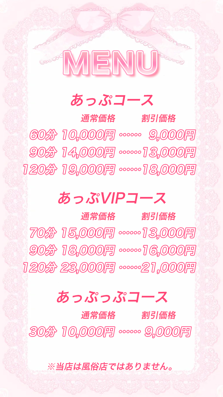 毎日頑張っている紳士の皆様、日頃の疲れになっている身体と心を、幸福なる雰囲気包まれた癒しの場所、落ちついた部屋の個室で可愛いセラピスト達がお待ちしております。当店のセラピストは若く容姿端麗にこだわりました、まるで蜜のように甘く幸せな空間でゆったりとした時間をお過ごし下さい。